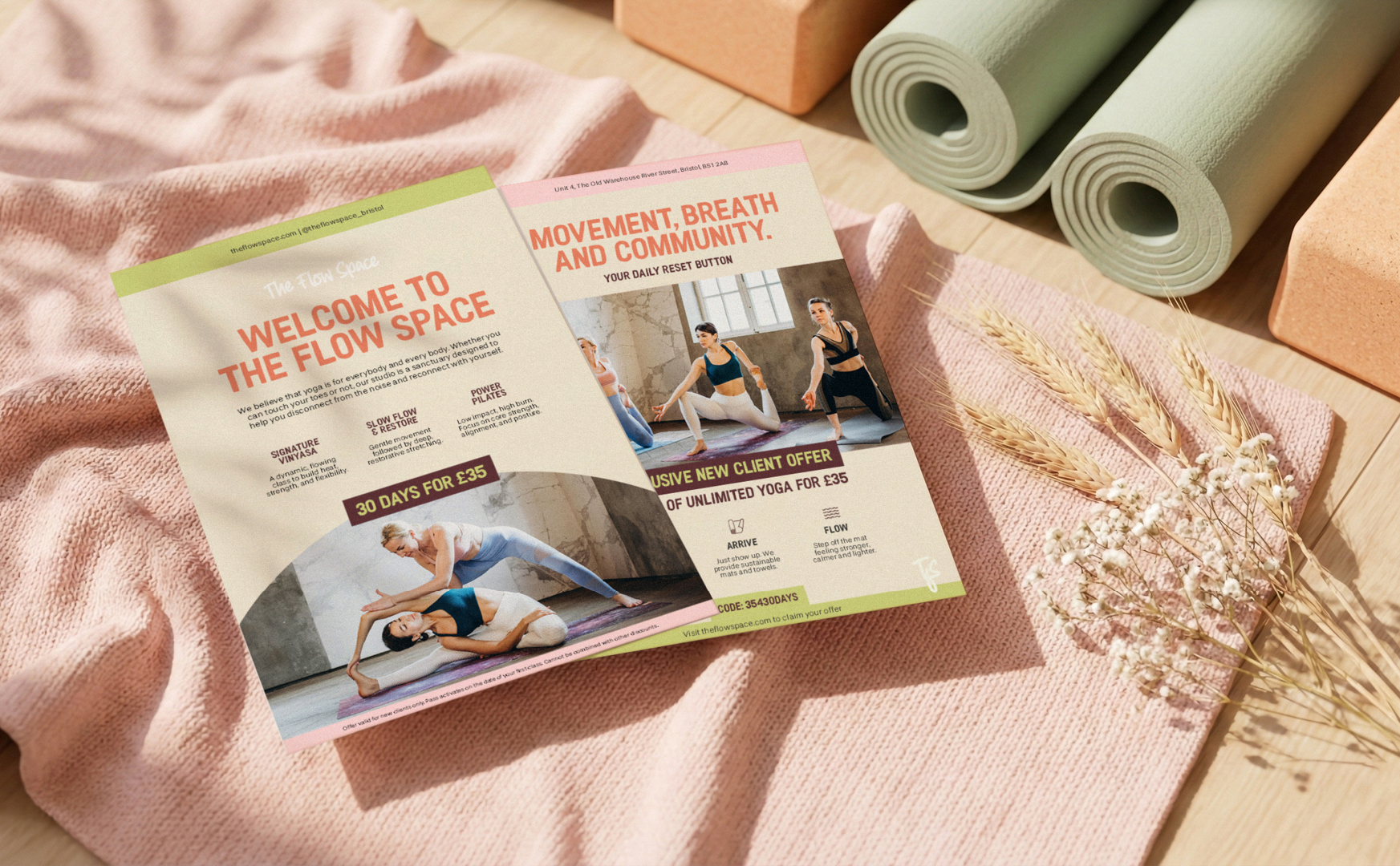 Print collateral, signage, social templates, and branded materials for a modern wellness yoga studio.